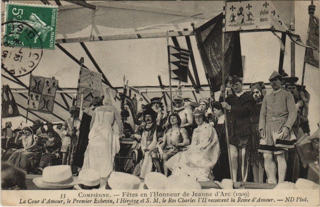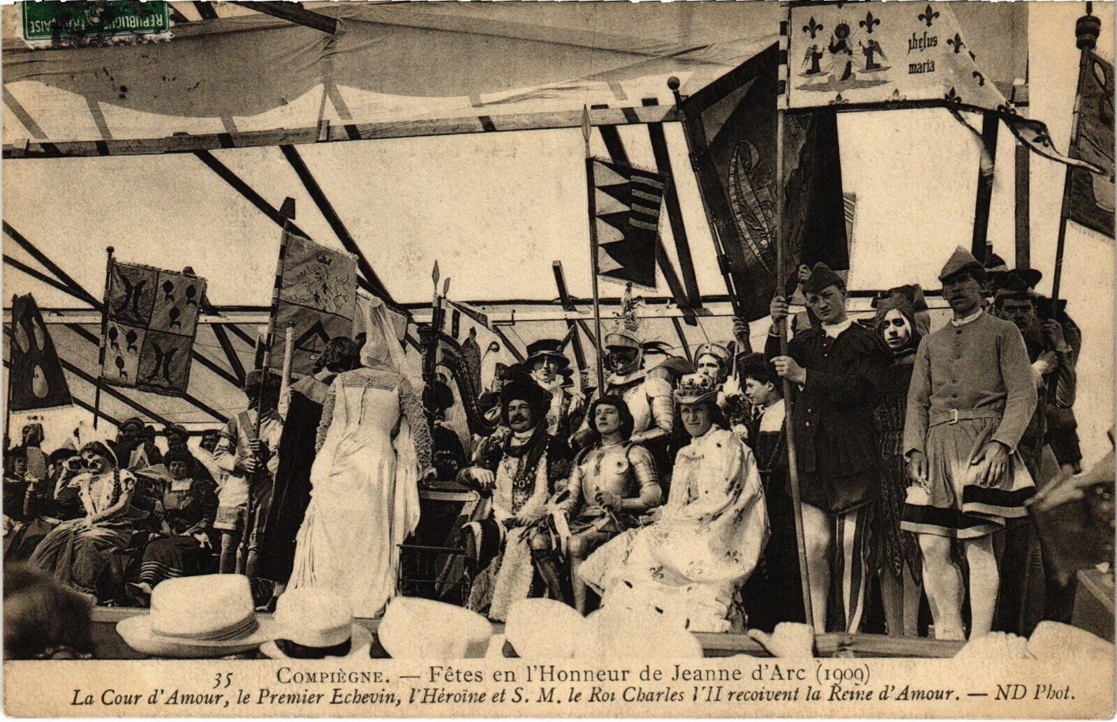 Version 3 : Republique FRANCAISE Jhclus 35 CoMPIEGNE Fêtes en ]Honneur de Jeanne d'Arc (19oo) La Cour d' Amour , le Premier Echevin, Héroïne et $ M. le Rou Charles VII recoivent Ia Rcine d' Amour . ND Phot . naria