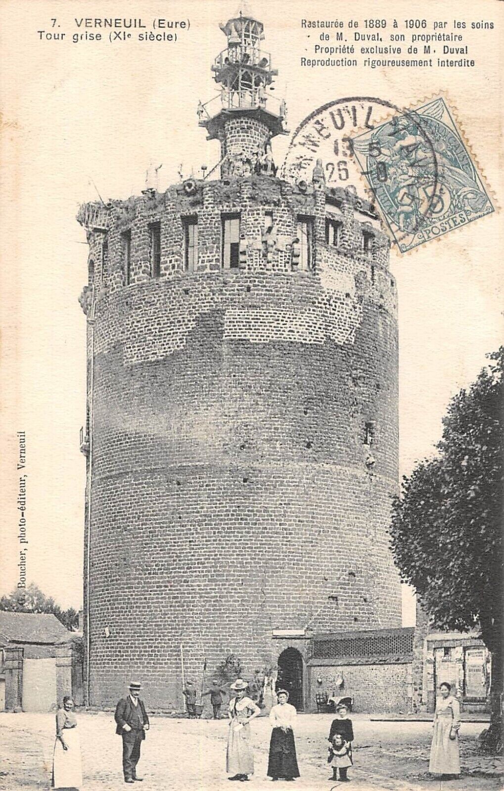 Version 2 : 7. VERNEUIL (Eure) Rastaurée de 1889 à 1906 par les soins Tour grise (XIe siècle) - de M. Duval, son propriétaire » Propriété exclusive de M. Duval Reproduction rigoureusement interdite ucher, photo-éditeur, Verneuil