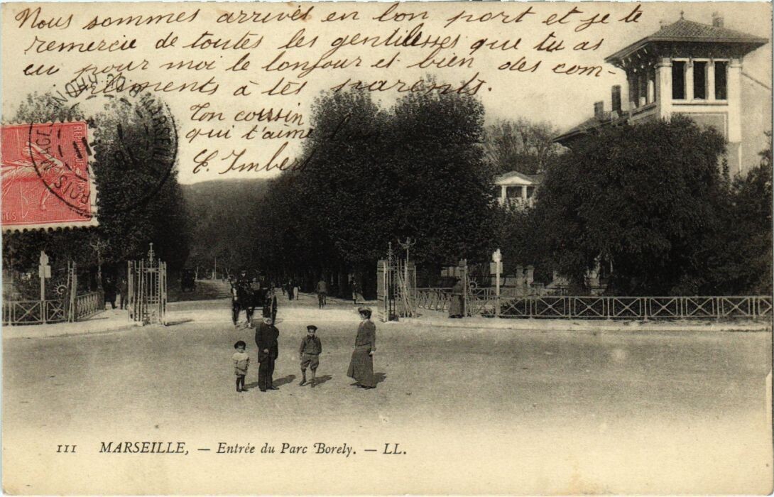 Version 3 : [II MCARSEILLE Entrée du Parc 'Borely. LL LBJBUYB, Tallleur, 8, Boulevard des Itallens, Paris. Costumes et Pardess 18 depuis 80 Pantalons depuls 25 fr,