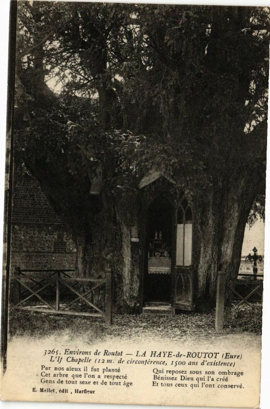 Version 1 : IA HAYE-de-ROUTOT (Eure) L'Ij Chapelie +12 mi de circcntererve, 1500 ans d'existence) Qui repose: sous son ombrage Henissez Dieu qui l'a cree cet x SU! l'ont conserte »265. Environs de Routot Par nos ascux 1! fut plante Cet arbre que l'on a respecte Gens de tout sexe et le teut age Fret ou E Mellet, edit , Harfur
