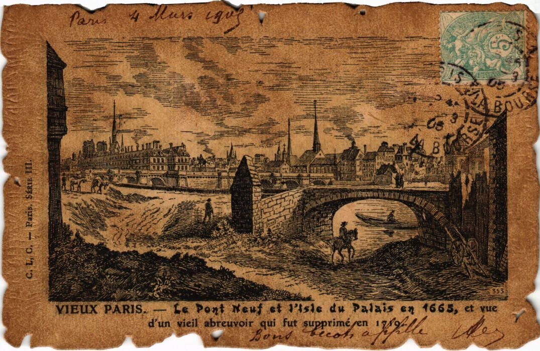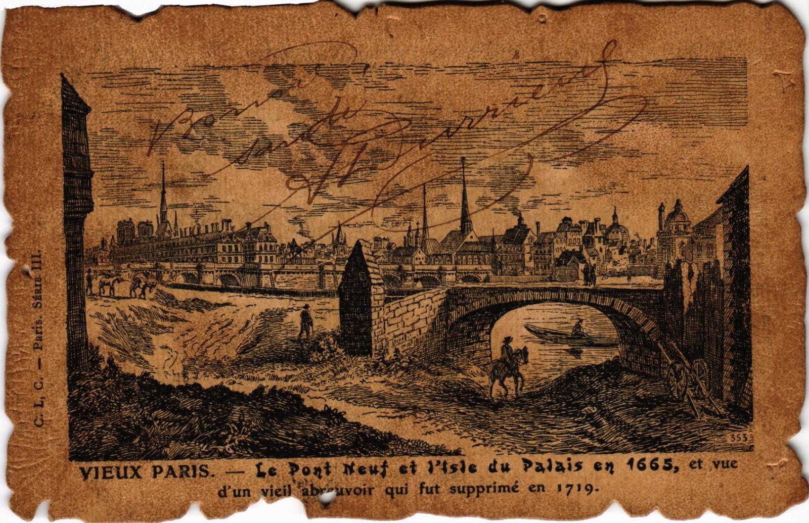 Vue du Pont-Neuf et de l'Isle du Palais du costé du Petit Bourbon en 1665, et vue d'un vieil abreuvoir qui fut supprimé en 1719.