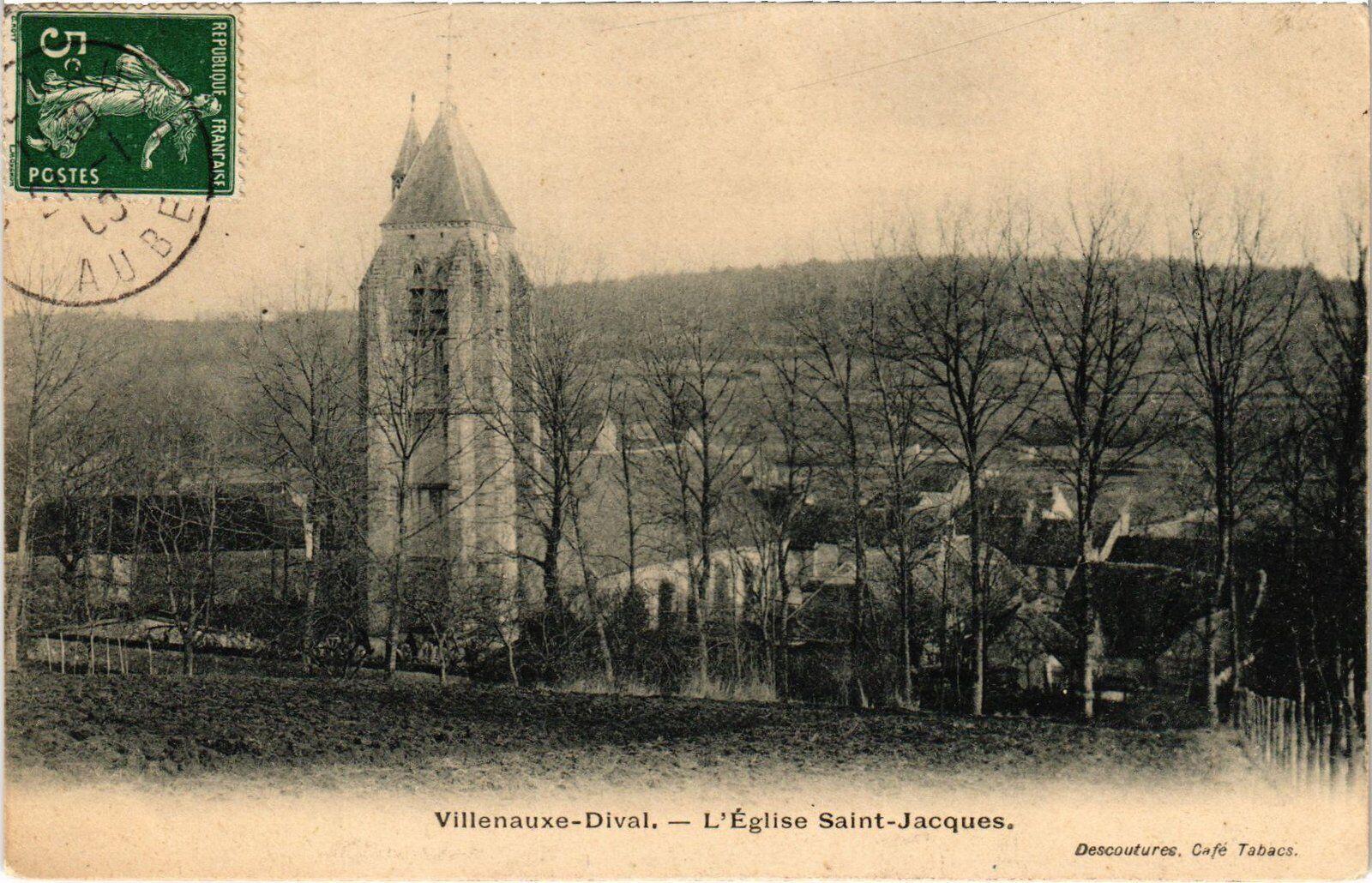 Version 2 : Villenauxe-Dival, — L'Eglise Saint-Jacques. Descoutures, Café Tabacs.